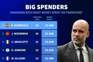 德轉(zhuǎn)列主教練轉(zhuǎn)會(huì)支出榜:瓜帥24.8億居首,穆帥、安帥分列二三