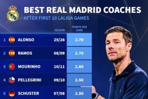 皇馬主帥前10場(chǎng)西甲場(chǎng)均拿分榜:阿隆索2.7分并列居首,穆帥第3