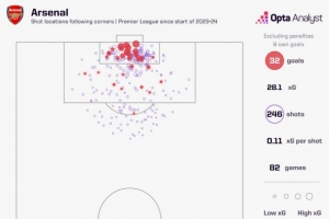 不包括烏龍球(因?yàn)闆](méi)有預(yù)期進(jìn)球值),阿森納在這段時(shí)間里預(yù)期進(jìn)球28.1的情況下攻入32球。僅看本賽季,阿森納在英超中主罰了45個(gè)角球,比任何其他球隊(duì)至少多4個(gè),其中賴(lài)斯主罰了24個(gè)。這些角球產(chǎn)生了18次射門(mén),其中有6次轉(zhuǎn)化為進(jìn)球。這意味著阿森納在超過(guò)三分之一的角球進(jìn)攻中都能形成射門(mén),并且有三分之一的射門(mén)能夠成功得分。