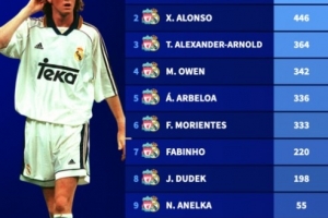 曾效力利物浦、皇馬球員為兩隊(duì)總出場(chǎng)次數(shù)排行:阿隆索446場(chǎng)第二