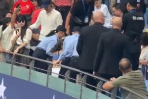 多名民警上前將其控制,她仍在尖叫掙扎,最終被抬出看臺(tái)。