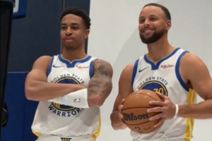 麥克米利安說:“我在等你拍完?!彪S后在大家的起哄下,他跑上前完成了合影心愿。庫里拍照時還笑著說:“這是延誤比賽啊。”