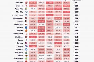 阿斯頓維拉、曼城以及水晶宮三支球隊并列第三,對手平均評分均為93.3。其中,曼城的賽程尤為引人注目,他們將連續(xù)客場挑戰(zhàn)布倫特福德和維拉,并在最后一場比賽中主場迎戰(zhàn)利物浦。