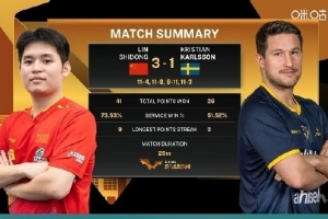 體育資訊10月2日訊 2025年WTT中國大滿貫?zāi)袉?/8決賽,林詩棟3-1克里斯蒂安-卡爾森,晉級八強。