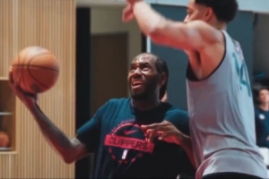 保羅、萊昂納德、哈登、祖巴茨和比爾合體進(jìn)行隊內(nèi)訓(xùn)練,萊昂納德迎著防守強硬上籃打進(jìn)。