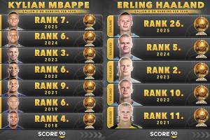 體育資訊10月03日訊 外媒Score90制作了一組對比圖,羅列了姆巴佩和哈蘭德的歷年金球獎排名。