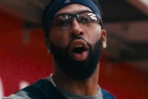 視頻當(dāng)中,濃眉戴著護(hù)目鏡底角三分一發(fā)入魂,場邊的歐文搞怪互動。