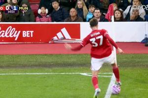 曼聯(lián)進球的角球“莫須有”?!慢鏡頭顯示,森林后衛(wèi)控球未出界