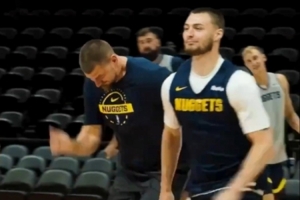 視頻當中,約基奇和布勞恩賽跑,約基奇步履踉蹌,布勞恩率先到達終點后比出獲勝手勢。
