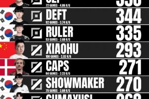體育資訊10月4日訊 今日有外媒統(tǒng)計了S賽正賽選手擊殺數(shù):
