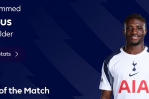 本場(chǎng)比賽熱刺球員庫杜斯發(fā)揮出色,打進(jìn)一球并且助攻一次,完成6次過人,賽后他也當(dāng)選英超官方球迷票選全場(chǎng)最佳球員。