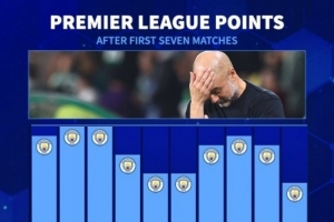瓜帥執(zhí)教曼城賽季前7輪比賽積分: