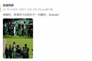 體育資訊10月6日訊 昨晚,北京國(guó)安俱樂部官方宣布主帥塞蒂恩離任。國(guó)安球員張?jiān)锤聜€(gè)人微博,向塞蒂恩送上祝福。