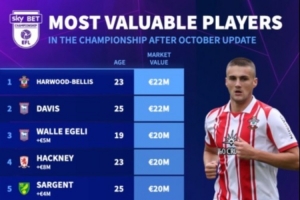 體育資訊10月6日訊 德轉更新英冠球員身價,在目前的英冠球員身價中,南安普頓球員貝利斯和伊鎮(zhèn)球員戴維斯2200萬歐并列第一。