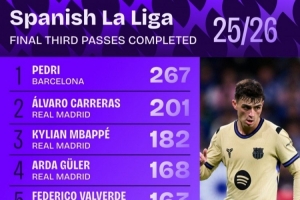體育資訊10月7日訊 日前,Squawka統(tǒng)計了本賽季西甲進(jìn)攻三區(qū)傳球次數(shù)排行,佩德里267次居首,5名皇馬球員進(jìn)前十。