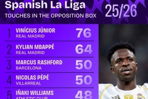 體育資訊10月7日訊 日前,Squawka統(tǒng)計(jì)了本賽季西甲禁區(qū)觸球次數(shù)排行,維尼修斯76次居首,姆巴佩64次第二。