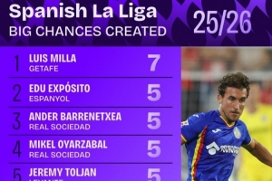體育資訊10月7日訊 日前,Squawka統(tǒng)計了本賽季西甲創(chuàng)造進球機會次數排行,