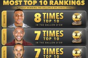 體育資訊10月07日訊 據(jù)外媒score90統(tǒng)計,姆巴佩8次入圍金球獎前十,但從未獲獎,歷史最多。