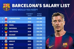 體育資訊10月10日訊 德國轉(zhuǎn)會(huì)市場列出了巴薩球員年薪排名,萊萬2080萬歐居首,德容1900萬歐次席。