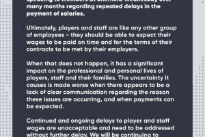 當(dāng)這未能實(shí)現(xiàn)時(shí),它對(duì)球員、工作人員及其家人的職業(yè)和個(gè)人生活都會(huì)產(chǎn)生重大影響。這種不確定性在缺乏關(guān)于這些問(wèn)題發(fā)生原因的明確溝通,以及何時(shí)能收到薪資的預(yù)期時(shí),會(huì)變得更加嚴(yán)重。