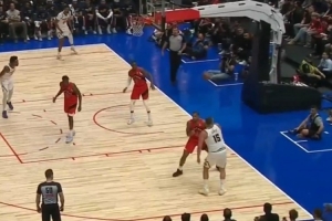 當(dāng)時(shí)約基奇被打,轉(zhuǎn)身之后底線(xiàn)一端單臂大掄傳將球送給另一端的卡梅隆-約翰遜,但后者三分沒(méi)能命中。