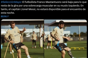 阿根廷官方寫道:“球員馬斯坦托諾的左大腿肌肉過度疲勞,將缺席接下來的巡回比賽。與此同時,隊長梅西也將缺席今晚的比賽。”