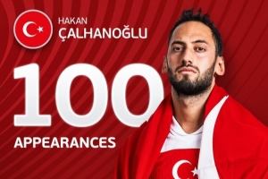 恰爾汗奧盧自2013年開始為土耳其效力,在這100場比賽中貢獻21球18助攻。