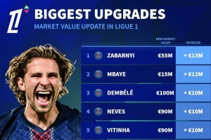 體育資訊10月12日訊 德國轉(zhuǎn)會(huì)市場更新法甲球員的身價(jià),并列出身價(jià)上漲榜單,扎巴爾尼+1300萬歐居首,巴黎球員占據(jù)前7名。