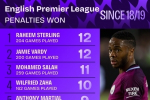 體育資訊10月12日訊 Squawka統(tǒng)計(jì)了2018-2019賽季以來球員在英超造點(diǎn)的次數(shù),并列出榜單,斯特林、瓦爾迪12次居首,薩拉赫11次第三。