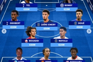 中場:布阿迪(里爾,3000萬歐)、馬尤盧(巴黎,5000萬歐)、奧多貝爾(熱刺,2000萬歐)、扎伊爾-埃梅里(巴黎,5000萬歐)、杜埃(巴黎,9000萬歐)