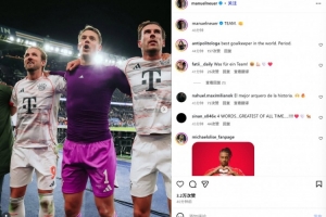 下半場少打一人,8次撲救守住勝利!諾伊爾社媒曬慶祝照:團隊!
