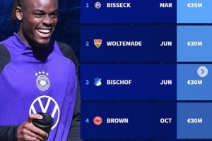 體育資訊10月16日訊 德國(guó)轉(zhuǎn)會(huì)市場(chǎng)盤點(diǎn)了足球強(qiáng)國(guó)2025年上演首秀的球員,德國(guó)共5名球員上演首秀,這包括了比塞克、沃爾特馬德。