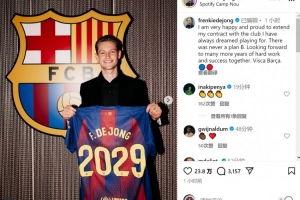 德容社媒曬出手拿續(xù)約紀念球衣的照片,配文:“我非常高興和自豪能夠與我一直夢想效力的俱樂部續(xù)約。我從來就沒有B計劃,期待在未來更多年里與大家共同努力、共創(chuàng)輝煌,巴薩萬歲。”