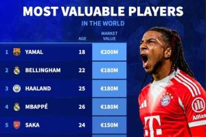 在西甲、意甲、法甲、德甲身價更新后,目前世界前20身價的球員如下。