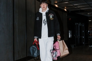 開拓者官方曬出了球員入場(chǎng)照,楊瀚森依然帶著自己的粉色小書包。
