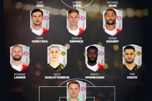 體育資訊10月18日訊 本輪德甲將上演焦點(diǎn)對(duì)決拜仁對(duì)陣多特,德甲官方也通過(guò)球迷票選評(píng)選出雙方最佳11人陣容,其中凱恩領(lǐng)銜拜仁9人在列,具體如下: