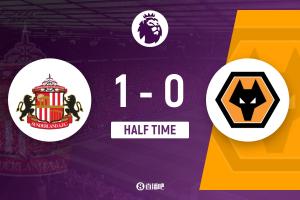 上半場比賽結(jié)束,桑德蘭1-0狼隊(duì)。