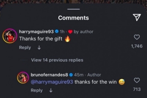 B費賽后社媒曬照慶祝勝利,馬奎爾留言:“謝謝你的禮物?!?/p>