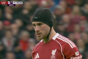 比賽剛開始姆伯莫破門,在進球前的爭頂,范迪克爭頂中肘擊麥卡利斯特。之后麥卡接受治療,頭上戴上了帽子繼續(xù)比賽。