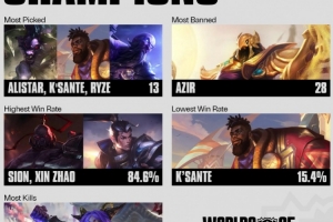 體育資訊10月20日訊 世界賽至今英雄BP數(shù)據(jù)如下: