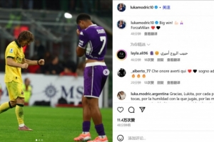 莫德里奇曬出了自己的賽場(chǎng)照,配文寫道:“偉大的勝利!Forza Milan。”