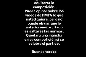 卡瓦哈爾:你好,特巴斯先生。違反規(guī)定就是玷污比賽。你可以對此前皇馬TV發(fā)布的視頻發(fā)表你想要說的任何意見。但你不能否認(rèn)之前所提到的內(nèi)容(海外賽)就是違反了規(guī)則。如果進行海外賽,你的比賽就會有污點。