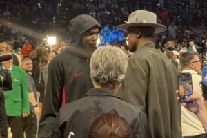 球隊名宿伊巴卡也來到現(xiàn)場見證這一時刻,賽前他和前隊友杜蘭特寒暄。