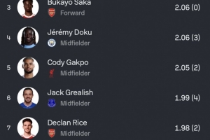 本賽季英超預(yù)期助攻排名:姆伯莫2.52次居首,恩迪亞耶、薩卡前三