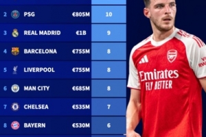 體育資訊10月23日訊 德國轉會市場更新了五大聯(lián)賽球員的最新身價,全球身價前100名的球員中,阿森納和巴黎圣日耳曼均有10人,兩隊可以說囤積了非常多的天才球員。