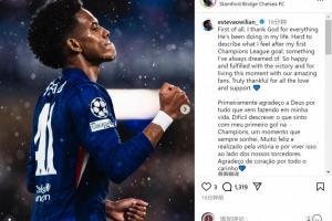 埃斯特旺社媒曬出慶祝進球的照片,配文:“首先我要感謝上帝在我生命中的一切恩典。難以描述攻入個人首個歐冠進球時的感受——這是我一直以來的夢想?!?/p>