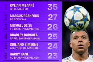 體育資訊10月23日訊 本賽季歐冠聯(lián)賽階段已戰(zhàn)罷3輪,Squawka統(tǒng)計了到目前為止對方禁區(qū)內(nèi)觸球次數(shù)榜單,姆巴佩35次第一,拉什福德27次第二。