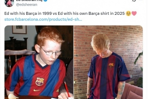 體育資訊10月24日訊 英國創(chuàng)作歌手艾德-希蘭更新社媒,曬出自己在1999年和2025年身穿巴薩球衣的照片。