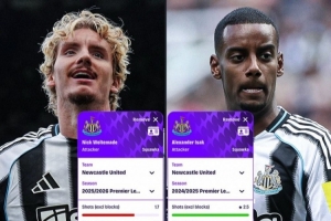 對比伊薩克上賽季,沃爾特馬德英超場均進(jìn)球持平且其他數(shù)據(jù)更出色