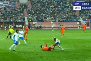這下太痛了!第43分鐘,宋浩宇防守時(shí)被倒地的羅競(jìng)踢到襠部